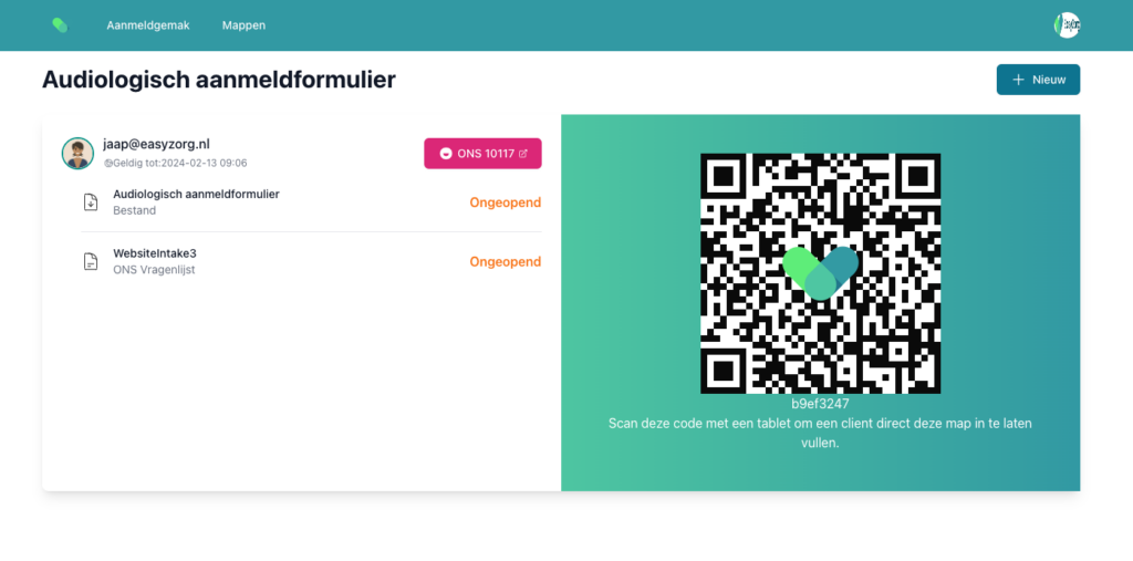 Wij bieden een QR-code aan zodat cliënten met een ander apparaat direct toegang hebben tot de benodigde pagina om de documenten in te vullen. Dit is met name handig wanneer u wilt dat de cliënt of een familielid ter plekke de documenten invult.