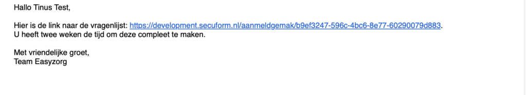 Zodra de aanmeldmap is geselecteerd en verzonden, zal de cliënt of een familielid de informatie ontvangen via een e-mail die vertrouwen wekt. Deze e-mail komt van een herkenbaar adres dat is gekoppeld aan uw organisatie – bijvoorbeeld info@beterthuiszorg.nl voor ‘Beter Thuiszorg’. Dit detail versterkt het vertrouwen en vermindert de kans op argwaan bij het ontvangen en invullen van de documenten.