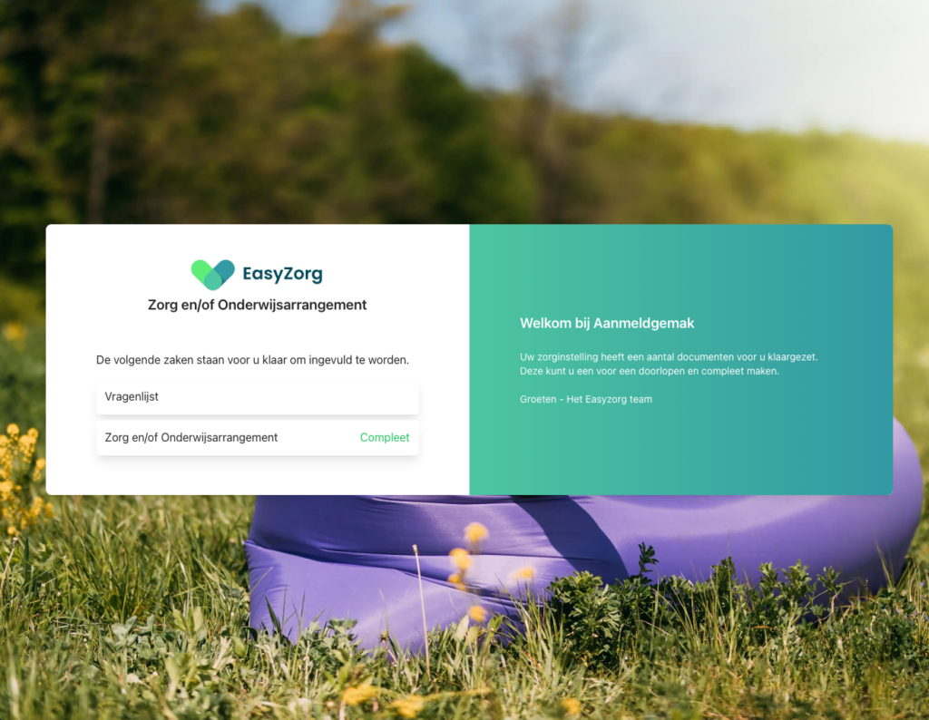 De cliënt of een familielid van de cliënt begint met de verwerking door de unieke link uit de ontvangen e-mail te openen. Deze link leidt direct naar een specifieke ‘Aanmeldgemak’-pagina die speciaal voor hen is gecreëerd. Op deze pagina is het proces helder uiteengezet: alle acties die nog uitgevoerd moeten worden staan duidelijk vermeld, en voltooide stappen worden gemarkeerd als ‘compleet’. Eenmaal afgeronde stappen zijn niet langer toegankelijk, wat zorgt voor een gestroomlijnde ervaring.