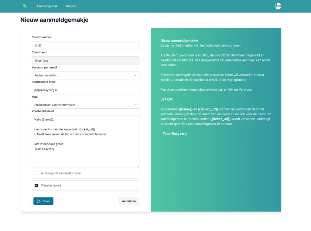 Na deze stappen wordt automatisch het clientnummer voor u ingevuld bij aanmeldgemak, zodat u snel en efficiënt het aanmeldgemakje kunt versturen zoals u in de volgende stap kunt zien.